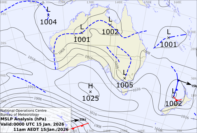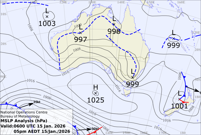 Weather map on the prior day Wed 14th Jan showing the strengthening upper level trough and the Low just about to form in Victoria at its southern end and warm moist air also being injected from across the Tasman Sea
