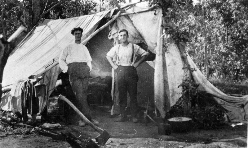 John Henry GLARE (my grandfather) and Ted TERRY (with hat) in their tent after a storm on the gold diggings at Dry Creek in Victoria c. 1915. These two traveled together as shearers in the Murray region from the Wimmera and Mallee eastwards to south-eastern NSW and Gundagai. When they were not shearing, they prospected for gold. But their paths parted after my grandfather met his bride in Linga, Victoria whom he married in 1919.